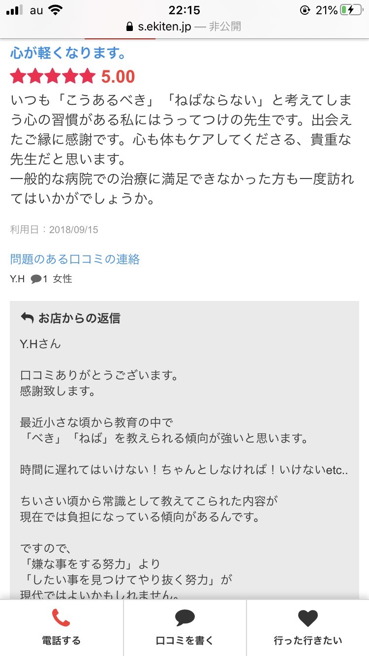 - いつも「こうあるべき」「ねばならない」と考えてしまう心の習慣がある私にはうってつけの先生です。出会えたご縁に感謝です。心も体もケアしてくださる、貴重な先生だと思います。 一般的な病院での治療に満足できなかった方も一度訪れてはいかがでしょうか。