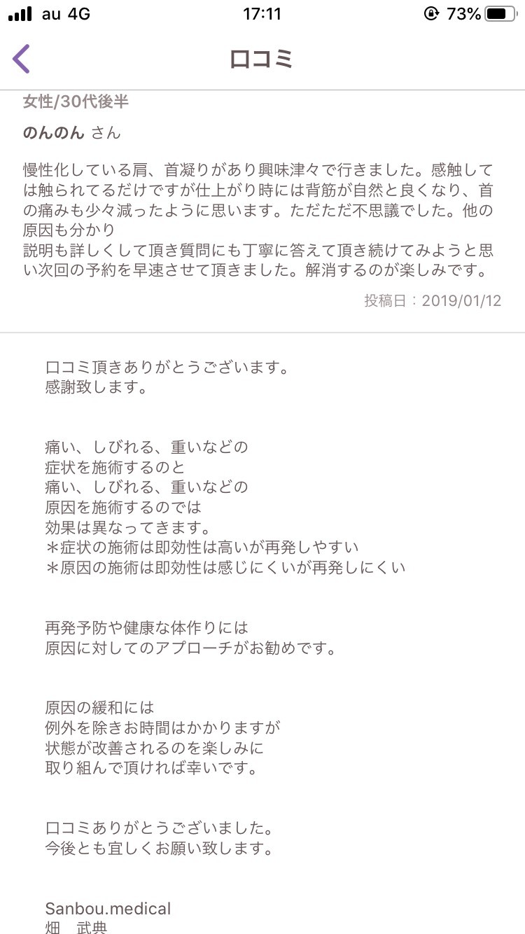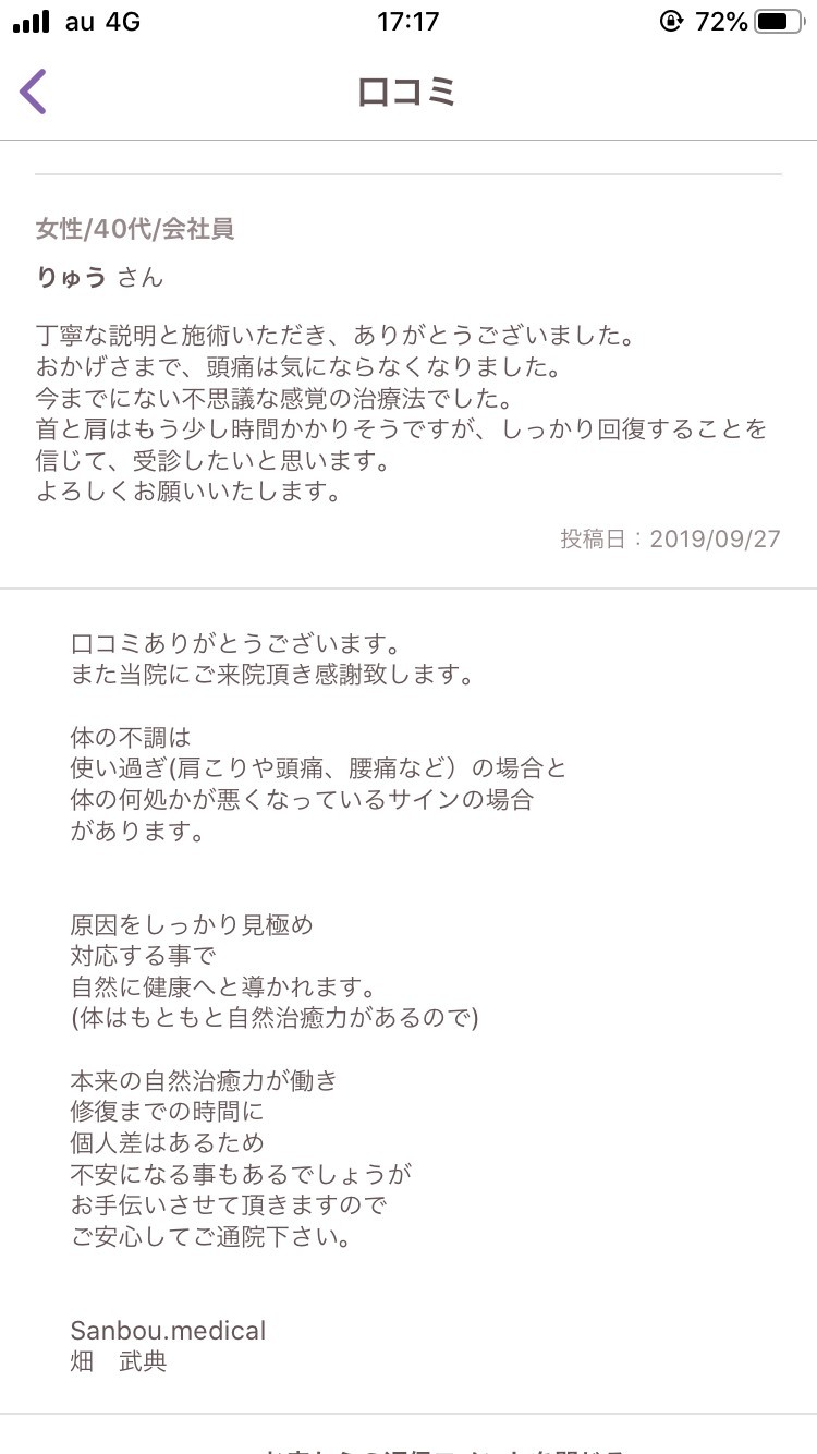 - 丁寧な説明と施術いただき、ありがとうございました。おかげさまで、頭痛は気にならなくなりました。今までにない不思議な感覚の治療法でした。首と肩はもう少し時間かかりそうですが、しっかり回復することを信じて、受診したいと思います。よろしくお願いいたします。