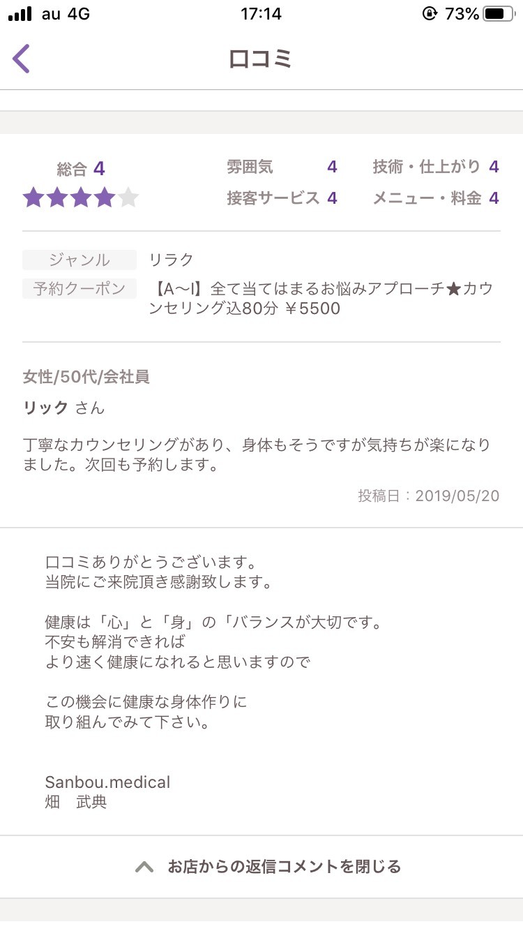 リック様50代 女性丁寧なカウンセリングで体も気持も楽になりました