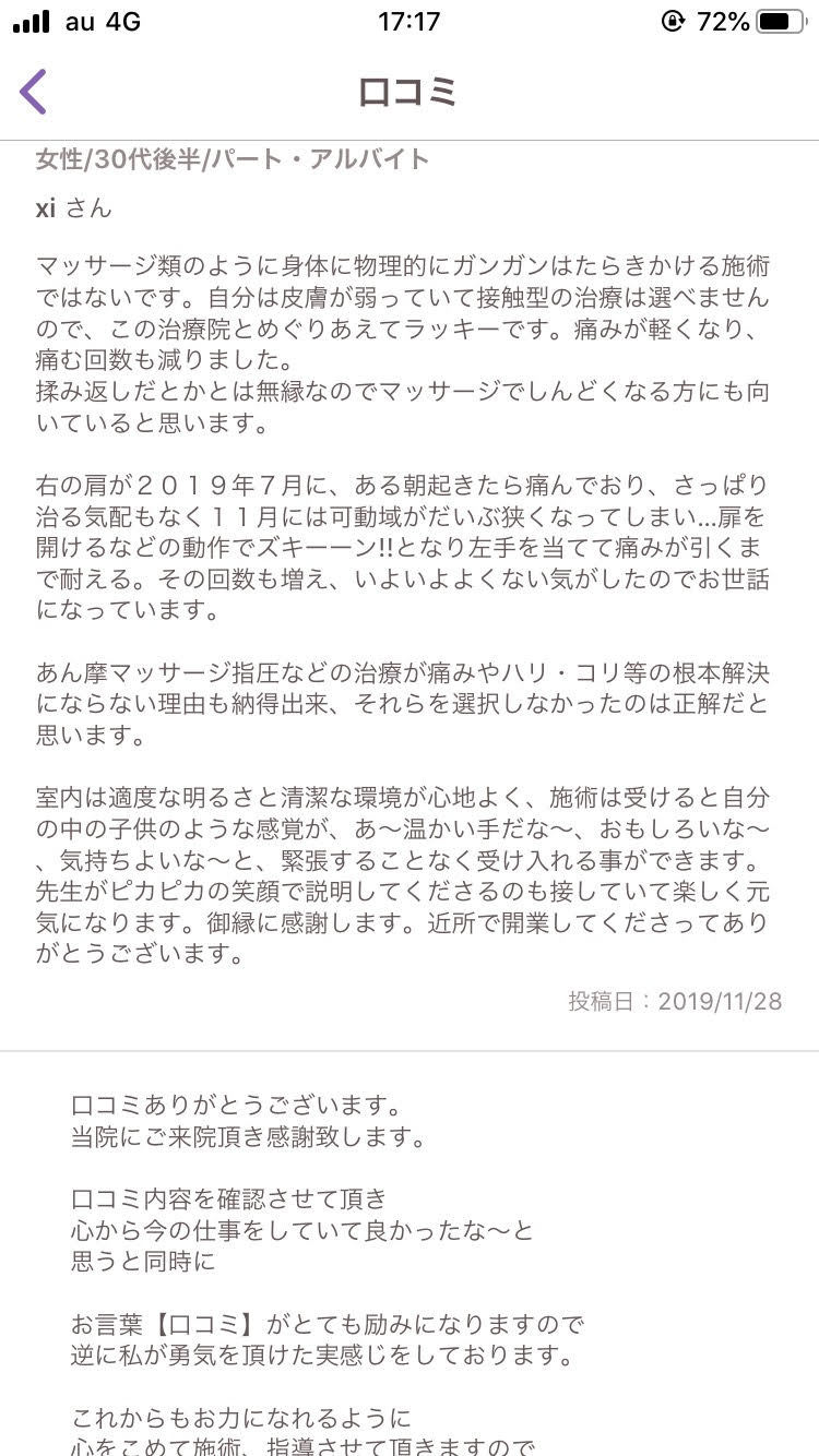 - マッサージ類のように身体に物理的にガンガンはたらきかける施術ではないです。自分は皮膚が弱っていて接触型の治療は選べませんので、この治療院とめぐりあえてラッキーです。痛みが軽くなり、痛む回数も減りました。 揉み返しだとかとは無縁なのでマッサージでしんどくなる方にも向いていると思います。右の肩が2019年7月に、ある朝起きたら痛んでおり、さっぱり治る気配もなく11月には可動域がだいぶ狭くなってしまい…扉を開けるなどの動作でズキーーン!!となり左手を当てて痛みが引くまで耐える。その回数も増え、いよいよよくない気がしたのでお世話になっています。あん摩マッサージ指圧などの治療が痛みやハリ・コリ等の根本解決にならない理由も納得出来、それらを選択しなかったのは正解だと思います。室内は適度な明るさと清潔な環境が心地よく、施術は受けると自分の中の子供のような感覚が、あ~温かい手だな~、おもしろいな~、気持ちよいな~と、緊張することなく受け入れる事ができます。先生がピカピカの笑顔で説明してくださるのも接していて楽しく元気になります。御縁に感謝します。近所で開業してくださってありがとうございます。
