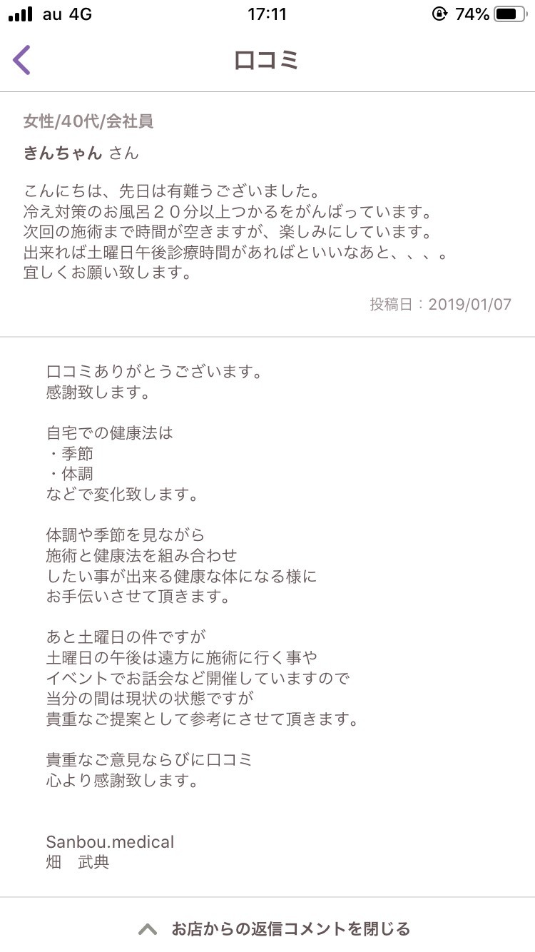 - こんにちは、先日は有難うございました。冷え対策のお風呂20分以上つかるをがんばっています。次回の施術まで時間が空きますが、楽しみにしています。出来れば土曜日午後診療時間があればといいなあと、、、。 宜しくお願い致します。