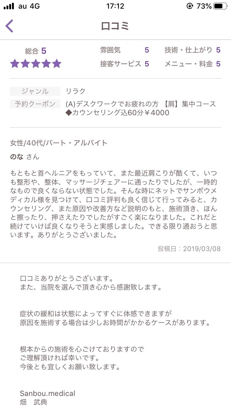 - もともと首ヘルニアをもっていて、また最近肩こりが酷くて、いつも整形や、整体、マッサージチェアーに通ったりでしたが、一時的なもので良くならない状態でした。そんな時にネットでサンボウメディカル様を見つけて、口コミ評判も良く信じて行ってみると、カウンセリング、また原因や改善方など説明のもと、施術頂き、ほんと擦ったり、押さえたりでしたがすごく楽になりました。これだと続けていけば良くなりそうと実感しました。できる限り通おうと思います。ありがとうございました。