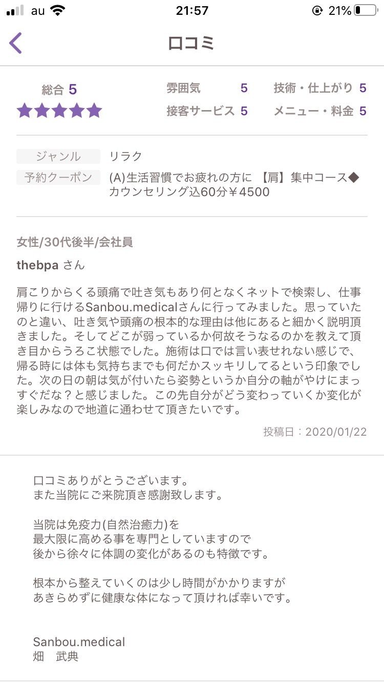 - 肩こりからくる頭痛で吐き気もあり何となくネットで検索し、仕事帰りに行けるSanbou.medicalさんに行ってみました。思っていたのと違い、吐き気や頭痛の根本的な理由は他にあると細かく説明頂きました。そしてどこが弱っているか何故そうなるのかを教えて頂き目からうろこ状態でした。施術は口では言い表せれない感じで、帰る時には体も気持ちまでも何だかスッキリしてるという印象でした。次の日の朝は気が付いたら姿勢というか自分の軸がやけにまっすぐだな?と感じました。この先自分がどう変わっていくか変化が楽しみなので地道に通わせて頂きたいです。
