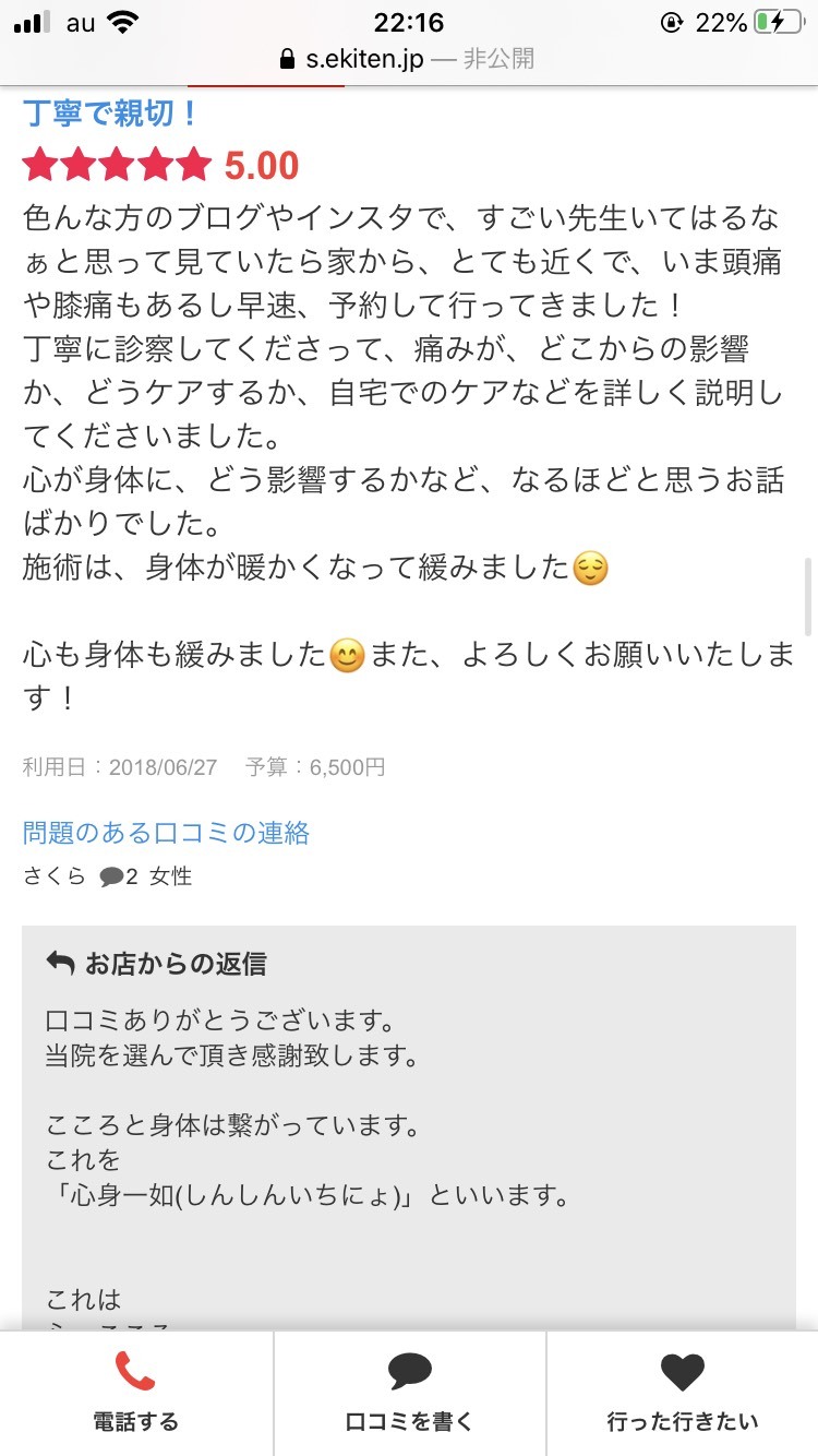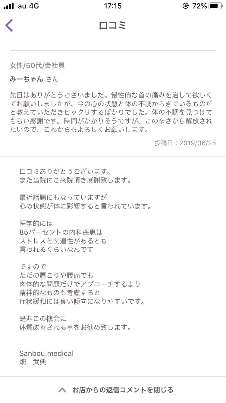 - 色んな方のブログやインスタで、すごい先生いてはるなぁと思って見ていたら家から、とても近くで、いま頭痛や膝痛もあるし早速、予約して行ってきました!丁寧に診察してくださって、痛みが、どこからの影響か、どうケアするか、自宅でのケアなどを詳しく説明してくださいました。心が身体に、どう影響するかなど、なるほどと思うお話ばかりでした。施術は、身体が暖かくなって緩みました心も身体も緩みましたまた、よろしくお願いいたします!